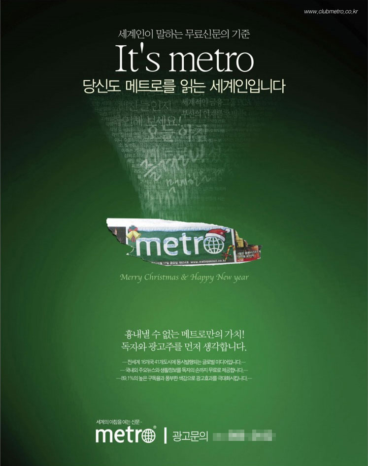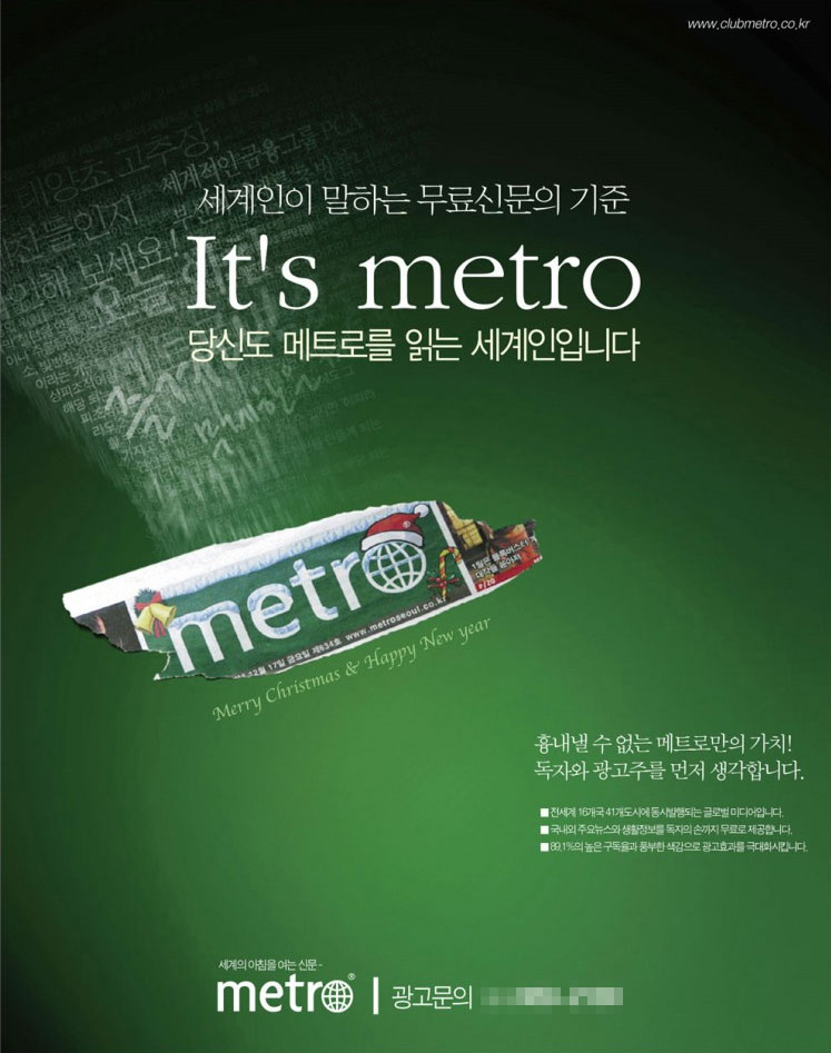 신문에 찢어진 느낌이 약간은 네가티브(요게 한글로 쓰기가 뭐해서...;;)적인 느낌도 들긴 하네요. 아침에 전철안에 metro를 보는 사람들의 모습들을 담아도 광고가 하나 나올듯 하지 않을까 생각도 들고^^