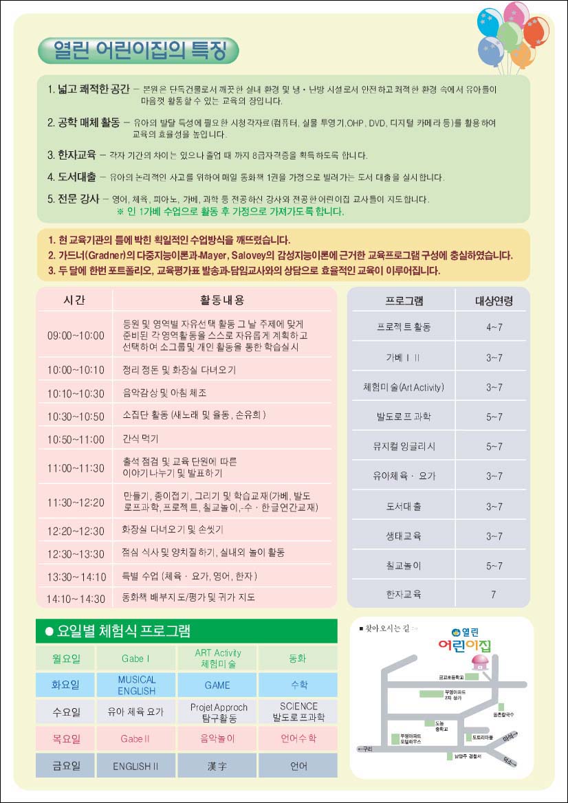 전단 맞아요?? 아닌거 같은데... 약도도 안 나와있고, 사진만 있고, 좀 노란색으로 유아틱하게 글씨체도 좀 바꿔 주세요!! 사진 옆에다 애들이 말하는 것처럼 풍선그림도 넣고...^^