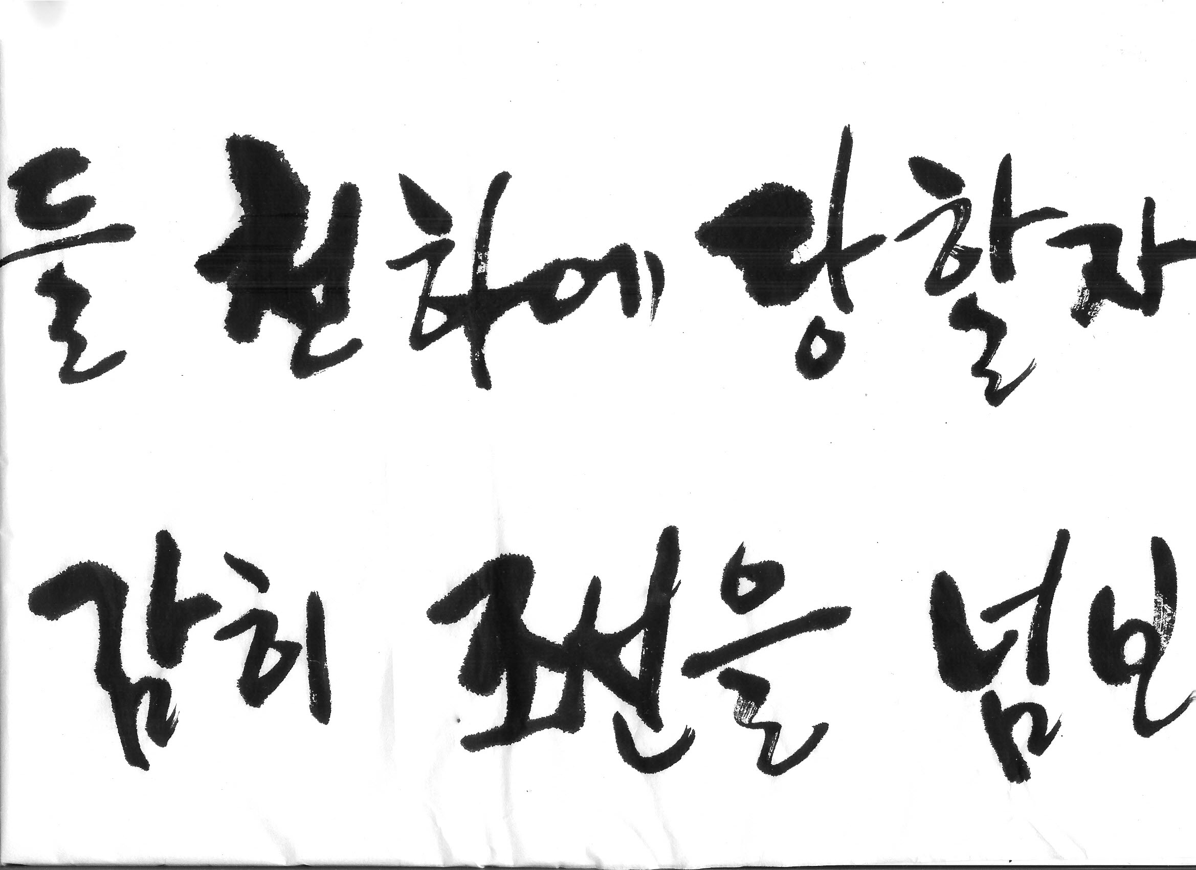 힘찬 캘리 부탁합니다. 김철호 일반 0 13309 2008.09.22 00:49 > > 조선의 영웅들, 천하에 당할 자 없으니 > > > 왜적이 어찌 감히 조선을 넘보리오 > > > > 이렇게 두 문장입니다. > 임진왜란을 주제로 한 캘리인데요. 염치없지만 부탁드려 볼꼐요. >