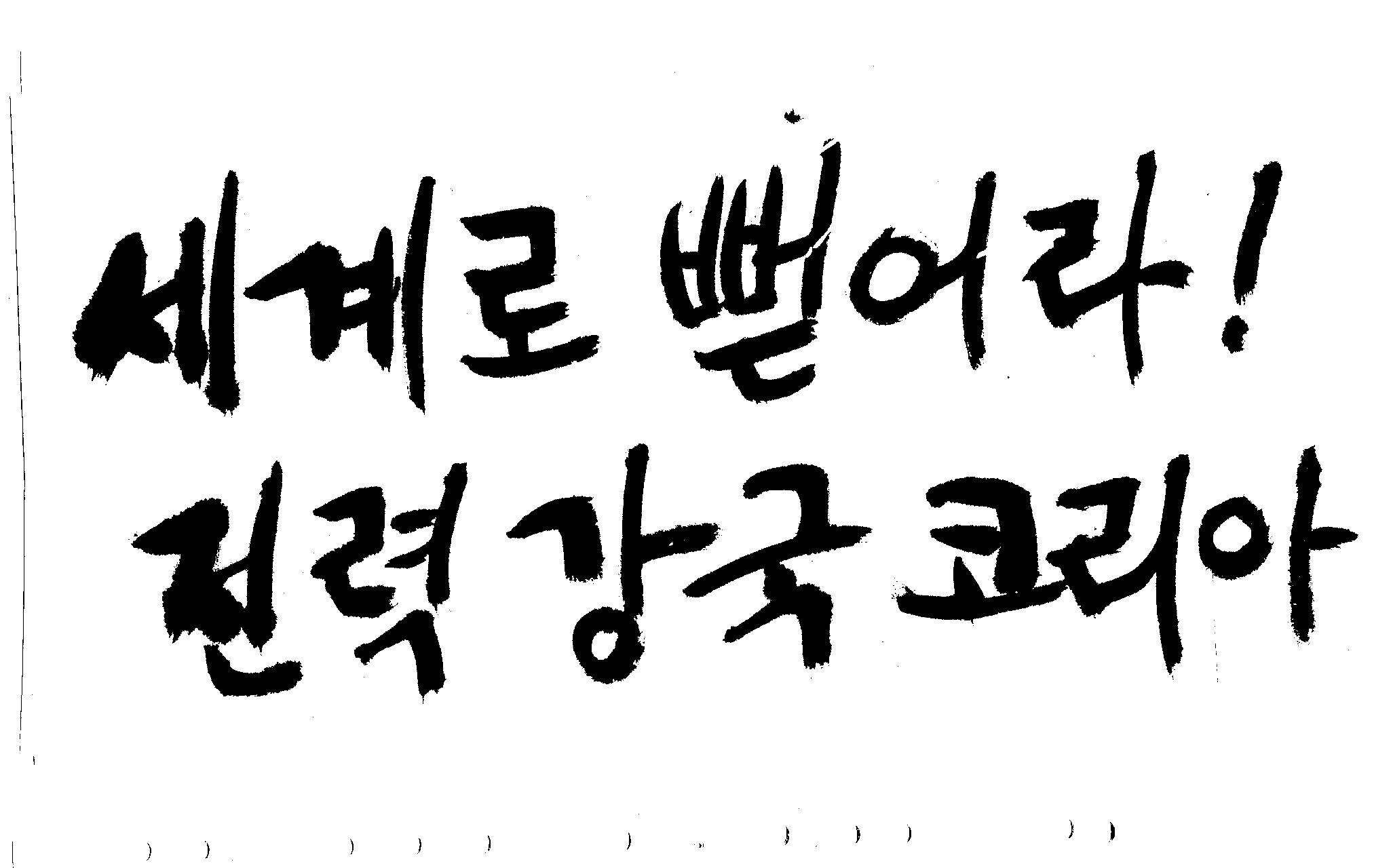 캘리 좀 부탁드려요!~ 김철호 일반 1 10982 2008.12.24 12:09 > > > > > 전력회사 신문광고를 하는데요 캘리로 멋지게 하고픈데 > > 캘리프로그램으로 아무리 써도 느낌이 안나옵니다 ㅜ.ㅜ > > 이런걸 부탁한다는 자체가 너무나도 염치없지만 부탁드립니다. > > > > 세계로 뻗어라! 전력강국 코리아 > > > 보기는 쉬워도 하기는 어려운게 > 세상 모든 일 일겁니다. > 그중에 캘리그라피가 그런것 일 겁니다... > 스캔중에 글꼴이 잘린것은 서로다른글꼴서 편집하시길... > 글수가 많아서 어쩔 수없네요... >